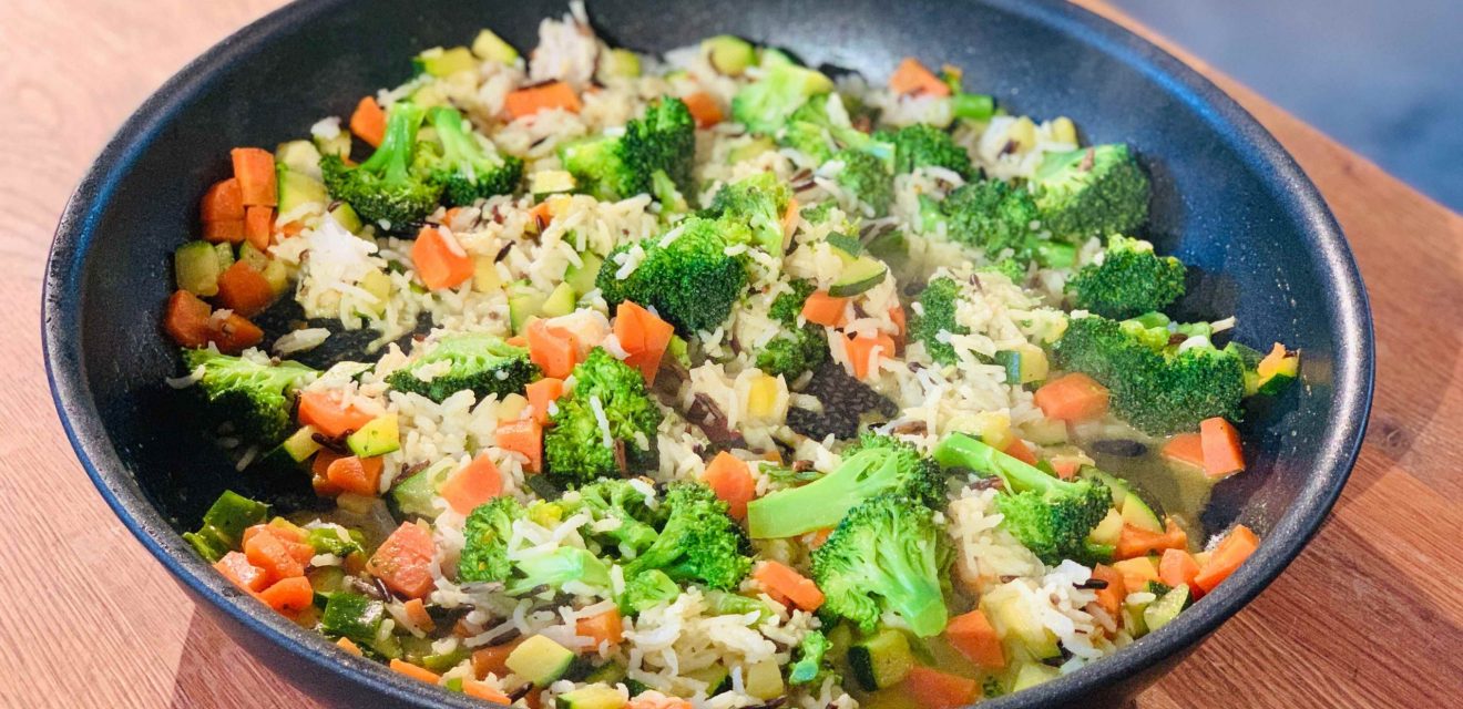Ruck, zuck zubereitet und extrem lecker: Die Brokkoli-Gemüse-Pfanne mit Basmati-Reis macht nicht nur satt und schmeckt richtig gut, sondern ist auch noch super gesund…